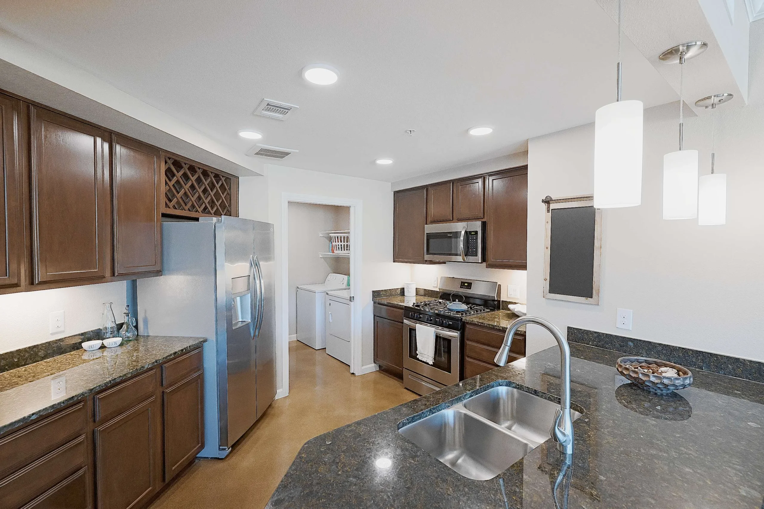 Each home includes nine- or ten-foot ceilings, double-pane windows, spa-like bathrooms, generous storage, and either in-unit washer/dryer connections or a full washer/dryer. Large private patios or balconies enhance the living experience. Gourmet kitchens are equipped with stainless steel appliances, granite countertops, pendant lighting, designer hardwood cabinets with under-cabinet lighting, gooseneck faucets, and a pantry. Select units feature side-by-side refrigerators, natural gas ranges, kitchen islands, wine racks, and USB outlets. Additional upgrades in select homes include Saltillo tiled entries, stained concrete or vinyl plank flooring, dual bathroom sinks, soaking tubs, glass-enclosed walk-in showers with tiled bench seating, and gas fireplaces.