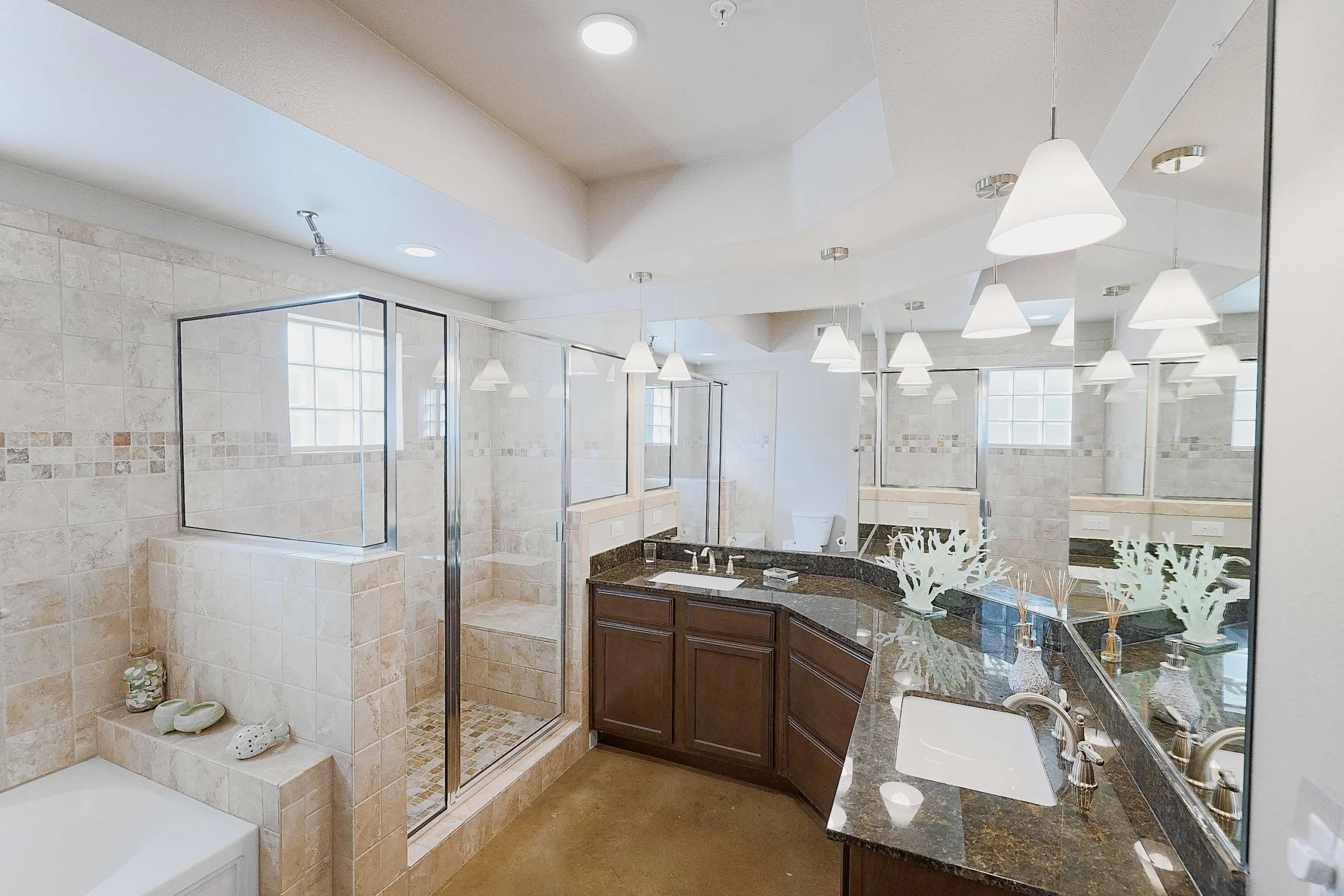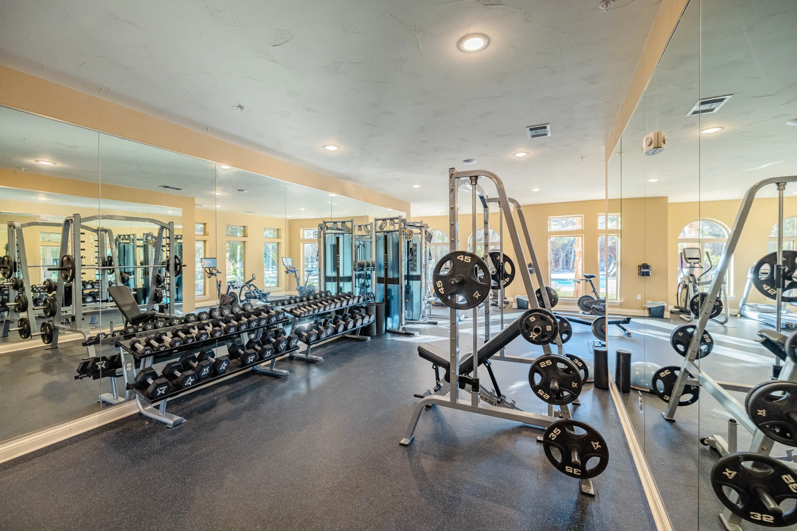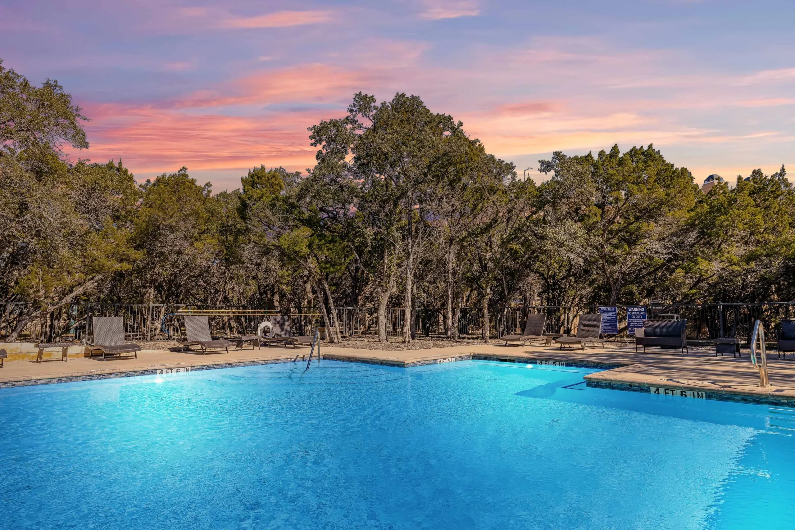 The community boasts resort-style amenities, including a two-tier swimming pool with a volleyball area, gas grills, and a spacious sundeck. A 24-hour fitness center with a yoga room provides ample wellness opportunities. The elegant clubhouse features a full kitchen, bar area, lounge spaces, a conference room, a veranda, a business center with complimentary WiFi, and a media room with shuffleboard and a pool table. Pet-friendly amenities include an off-leash dog park and a dog wash station. Residents can also enjoy an indoor spa with a cascading waterfall, steam room, and cedar sauna.