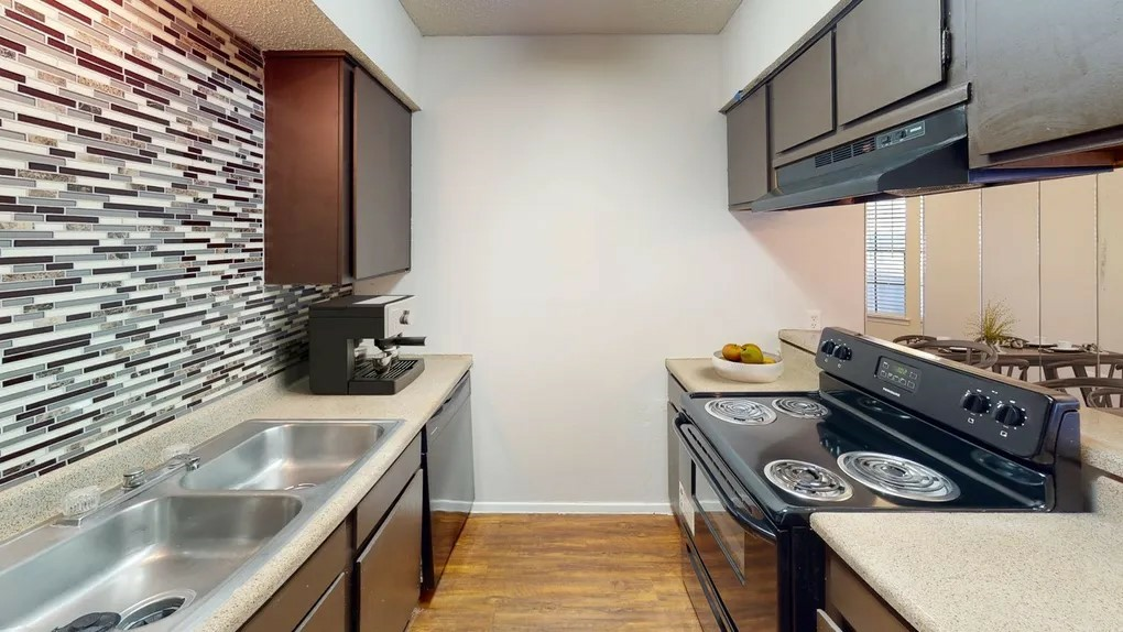 The one and two-bedroom apartment homes feature modern designs with upgraded amenities. Each unit includes spacious layouts, ample storage with extra cabinets and closets, ceiling fans, 2″ faux wood blinds, solar screens, and plank flooring.