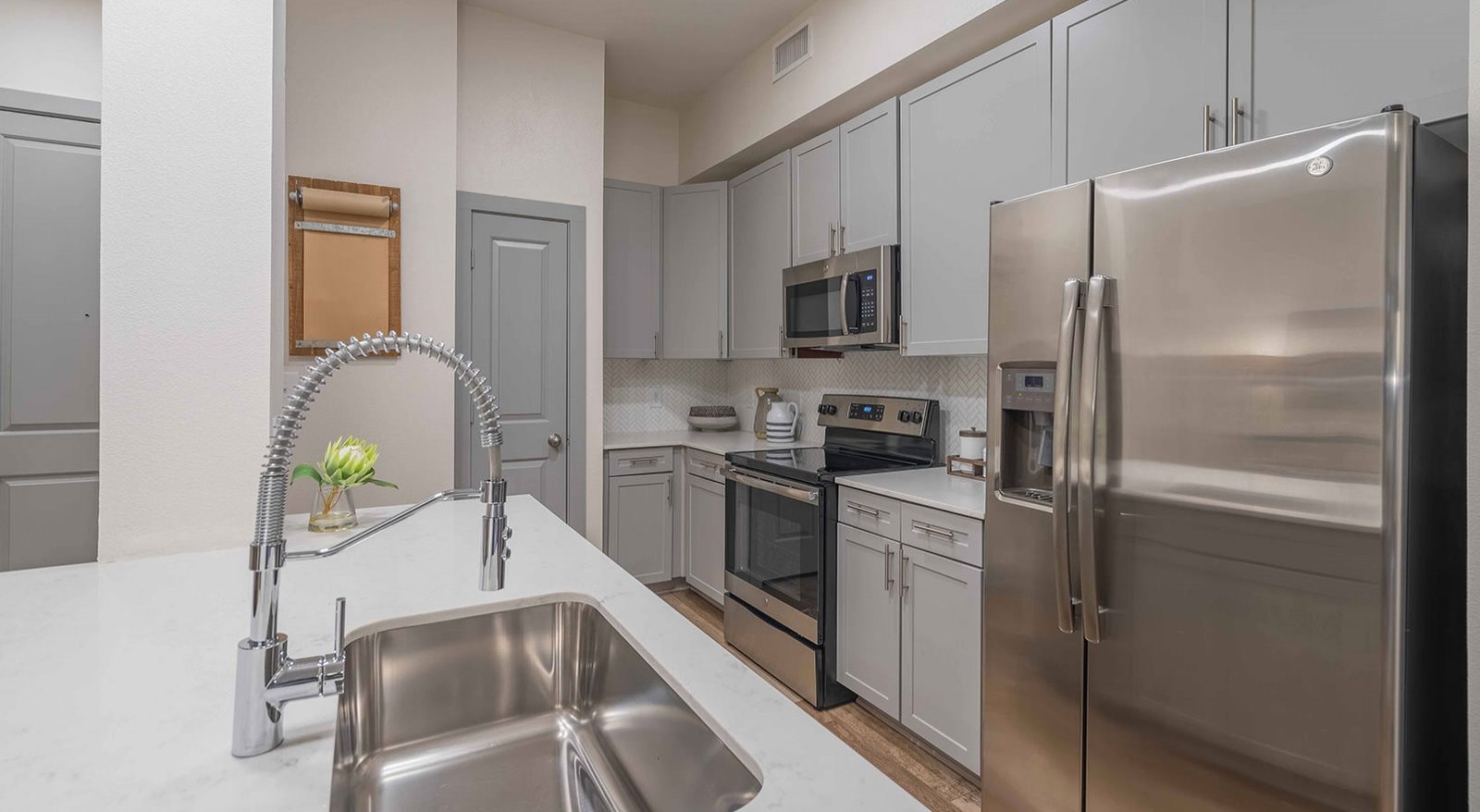 Seville Uptown offers pet-friendly apartments with modern finishes, such as quartz countertops, a stainless-steel double-compartment sink, and a stone backsplash in the kitchen. With a convenient kitchen island for additional storage and easy cleanup, preparing favorite meals is a breeze. High ceilings and oversized windows provide stunning city views and a bright, energetic atmosphere. Residents can also enjoy access to a fitness center and a resort-inspired swimming pool with a sunning ledge. Experience luxury living at its finest at Seville Uptown, in the dynamic Uptown Dallas, Texas.