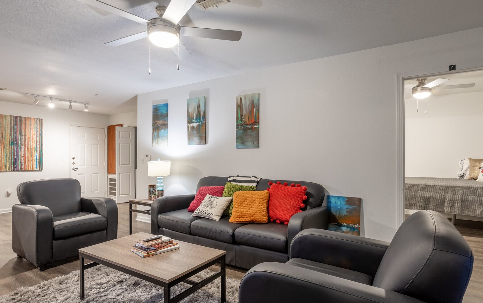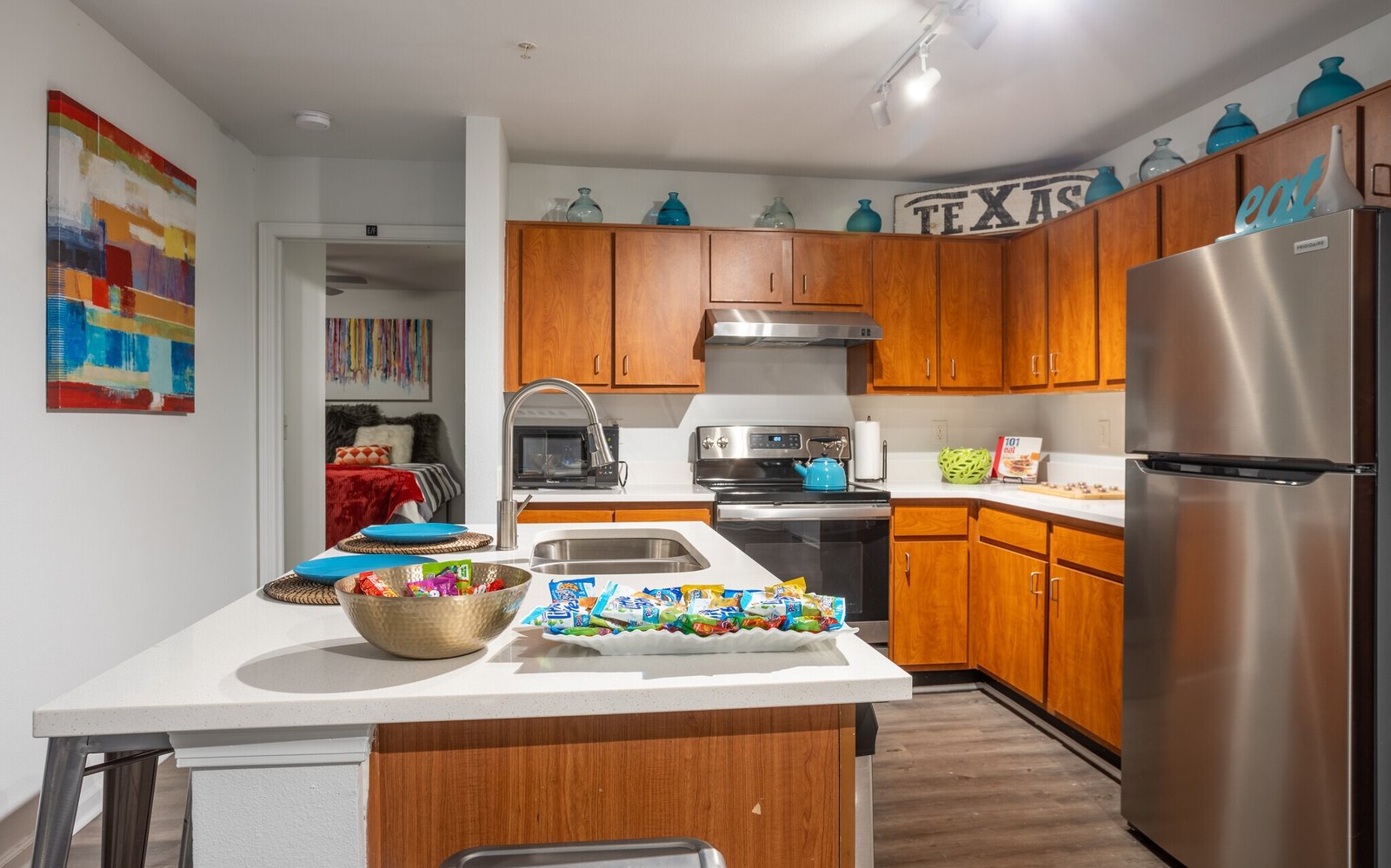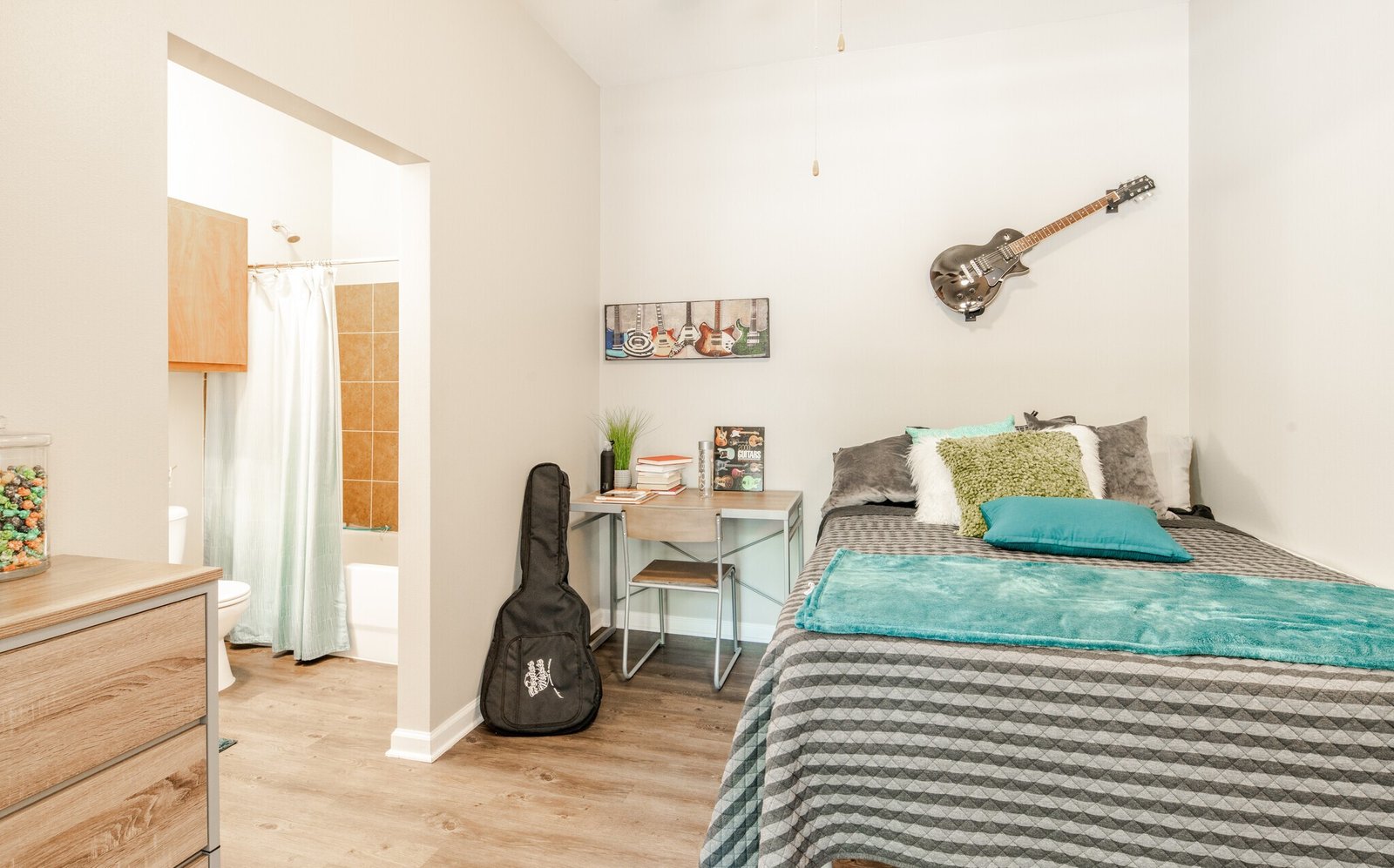Sparq on Rio (formerly Rio West) offers off-campus living just steps from The University of Texas at Austin. This community features fully furnished two-, three-, and four-bedroom apartments, each with private bedrooms, spacious common areas, a wall-mounted flat-screen TV, and a full-sized in-unit washer and dryer.