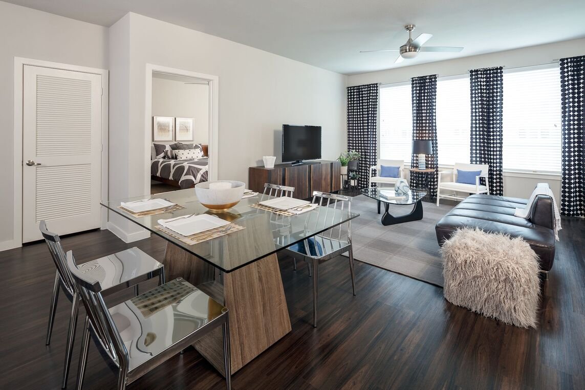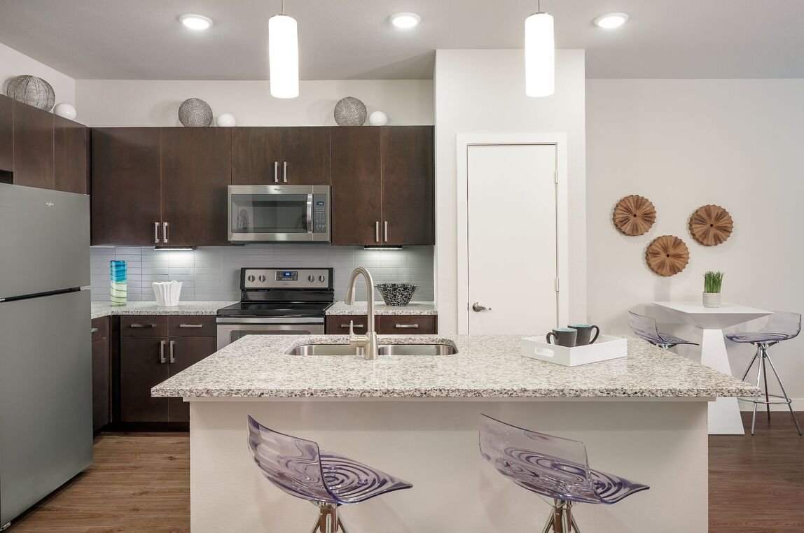 The apartments themselves are designed with modern living in mind. Each one and two-bedroom unit features sleek cabinetry, stainless steel appliances, USB charging ports, and wood-style floors, ensuring a stylish and comfortable home.