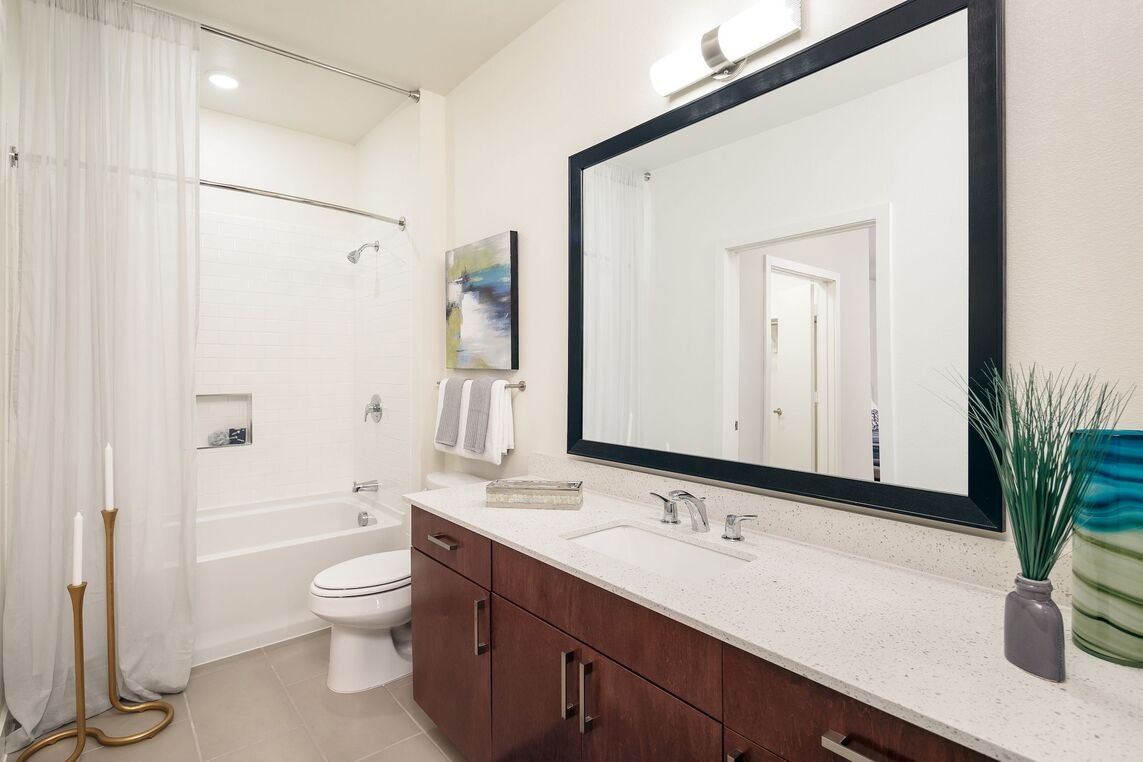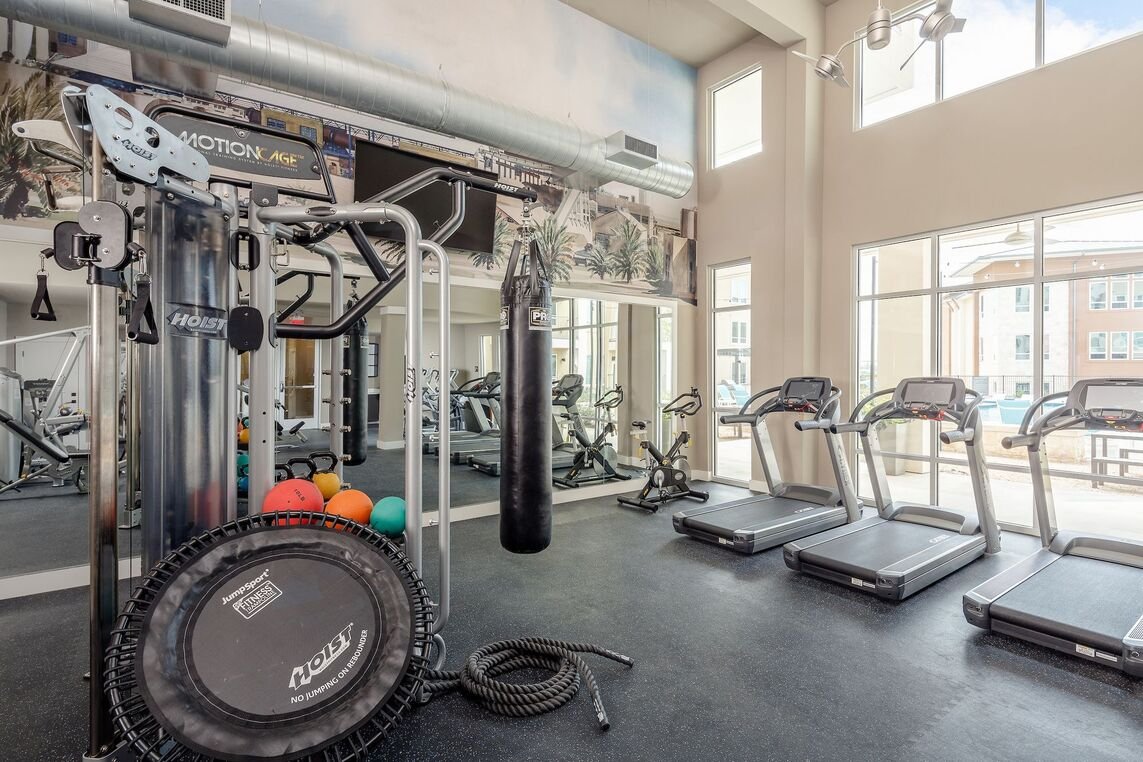 Upon entering the community clubhouse, guests are greeted by contemporary lounge chairs and a Starbucks coffee bar, perfect for socializing or enjoying a pick-me-up. The resort-style swimming pool is complemented by lounge chairs, hammocks, and shaded areas. Additionally, the 24-hour fitness center is fully equipped with state-of-the-art equipment for a powerful workout.